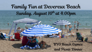Family Fun at Devereux BeachAugust 10, 2025 4:00 pm 99 Ocean Avenue, Marblehead, MA Devereux Beach Directions We’ll meet on the beach in front of the playground. Questions? Contact Sue McNamara