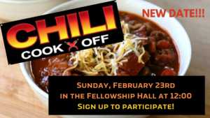 Please sign up here (or on the sheet on the back table) to bring your best pot of chili. Chili can be any variety you like. Prizes will be awarded for 1st, 2nd, and 3rd place finishers. Also, if you would like to participate, but are not interested in cooking chili, please sign up to bring some cornbread, drinks, or dessert. Questions? Contact Rachel Schaffner or Sue McNamara
