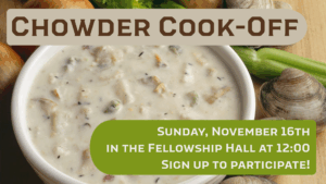 Please Sign Up Here (or on the sheet on the back table) to bring your best pot of chowder on Sunday, November 16th. Chowders can be any variety. Prizes will be awarded for 1st, 2nd, and 3rd place finishers. Also, if you would like to participate, but are not interested in cooking chowder, please sign up to bring oyster crackers, salads, drinks, or desserts. Questions? Contact Rachel Schaffner or Sue McNamara,