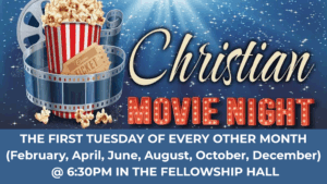 Christian Movie Night will be held the first Tuesday of the even-numbered months (February, April, June, August, October, and December). Questions? Contact Sue McNamara