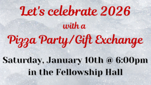 All ages are welcome to join us on Saturday, January 10th @ 6:00pm in the Fellowship Hall for pizza and a fun gift exchange. Please bring a wrapped gift for less than $10 for each person participating in the exchange. We will have an exchange for children and one for adults, so that the gifts are age appropriate.